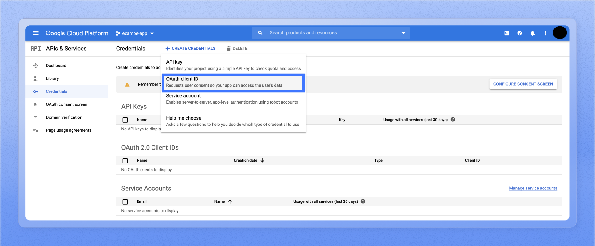 4. Navigate to the Credentials screen, click Create Credentials, and select OAuth client ID from the options given.